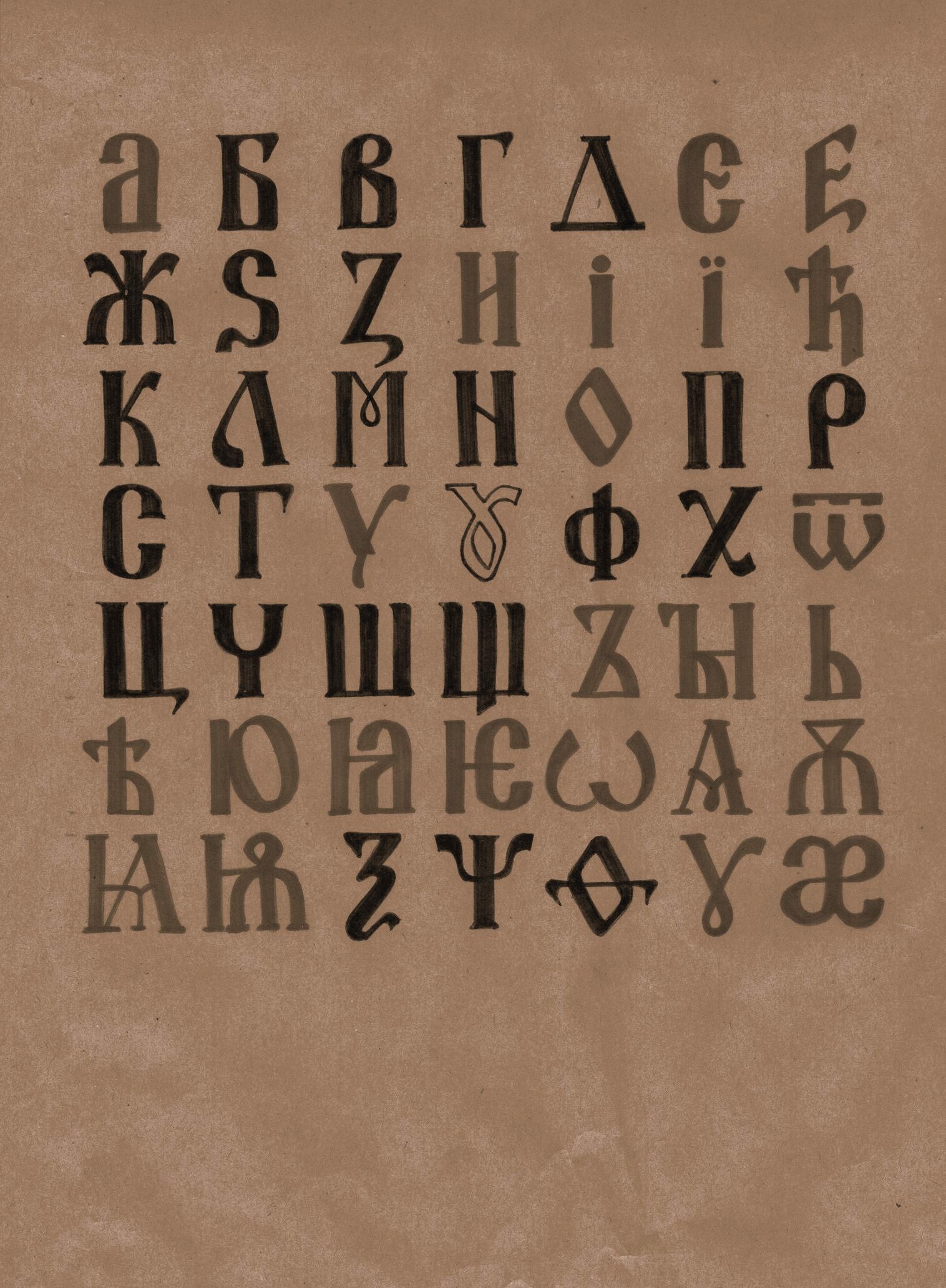 Alfabeto eslavo antiguo reconstruido. En el alfabeto antiguo eslavo y glagolítico las letras tienen tanto sonido y como una palabra identificada a cada letra.
